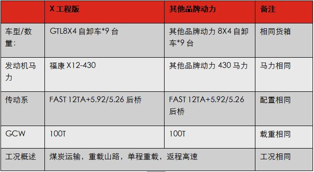 数据分析结果显示:配置福康X12动力的欧曼自卸车辆经济性在全程运行和爬坡运行两个工况均优于其他车辆。