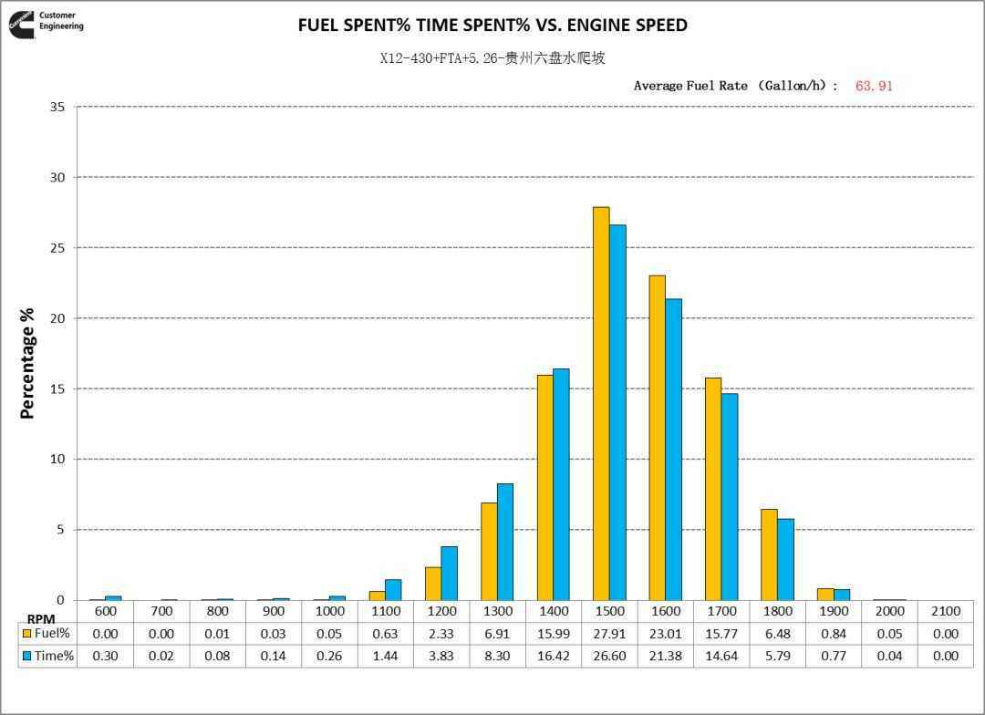 从Duty cycle分布看,车辆工况较恶劣,多运行在满负荷区域,相比之下福康X12发动机在外特性运行占比稍少,得益于X12-430发动机比其他品牌动力扭矩更大,具备更优的道路坡度适应性,动力性占优势。